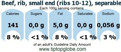 GDA, caloric and nutritional values: Beef, rib, small end (ribs 10-12), separable lean only, trimmed to 1/8 fat, all grades, raw