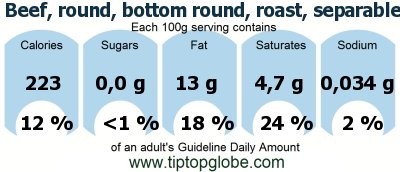 Beef, round, bottom round, roast, separable lean and fat, trimmed to 1/8 fat, choice, cooked, roasted: Food, drinks and meals: GDA, caloric and nutritional values