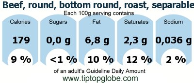 GDA, caloric and nutritional values: Beef, round, bottom round, roast, separable lean only, trimmed to 1/8 fat, choice, cooked, roasted