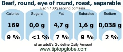 Beef, round, eye of round, roast, separable lean only, trimmed to 1/8 fat, all grades, cooked, roasted: Food, drinks and meals: GDA, caloric and nutritional values