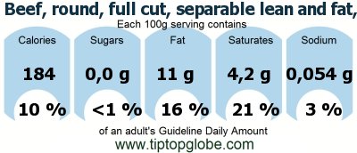 GDA, caloric and nutritional values: Beef, round, full cut, separable lean and fat, trimmed to 1/8 fat, select, raw