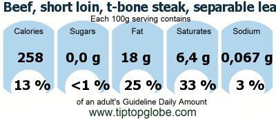 Beef, short loin, t-bone steak, separable lean and fat, trimmed to 0 fat, USDA choice, cooked, broiled: Food, drinks and meals: GDA, caloric and nutritional values