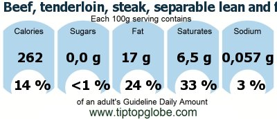 GDA, caloric and nutritional values: Beef, tenderloin, steak, separable lean and fat, trimmed to 1/8 fat, select, cooked, broiled