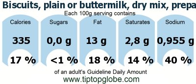 Biscuits, plain or buttermilk, dry mix, prepared: Food, drinks and meals: GDA, caloric and nutritional values