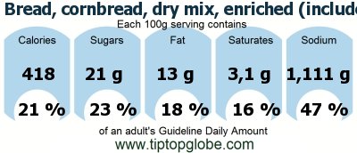 Bread, cornbread, dry mix, enriched (includes corn muffin mix): Food, drinks and meals: GDA, caloric and nutritional values