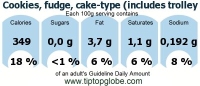 Cookies, fudge, cake-type (includes trolley cakes): Food, drinks and meals: GDA, caloric and nutritional values