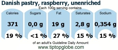 Danish pastry, raspberry, unenriched: Food, drinks and meals: GDA, caloric and nutritional values