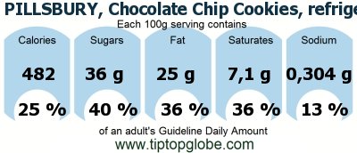 PILLSBURY, Chocolate Chip Cookies, refrigerated dough: Food, drinks and meals: GDA, caloric and nutritional values