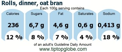 Rolls, dinner, oat bran: Food, drinks and meals: GDA, caloric and nutritional values