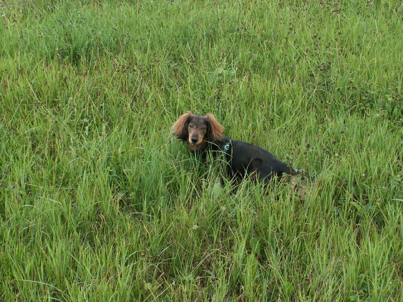 Šelma vyrušená při lovu-jezevčík v polní zeleni